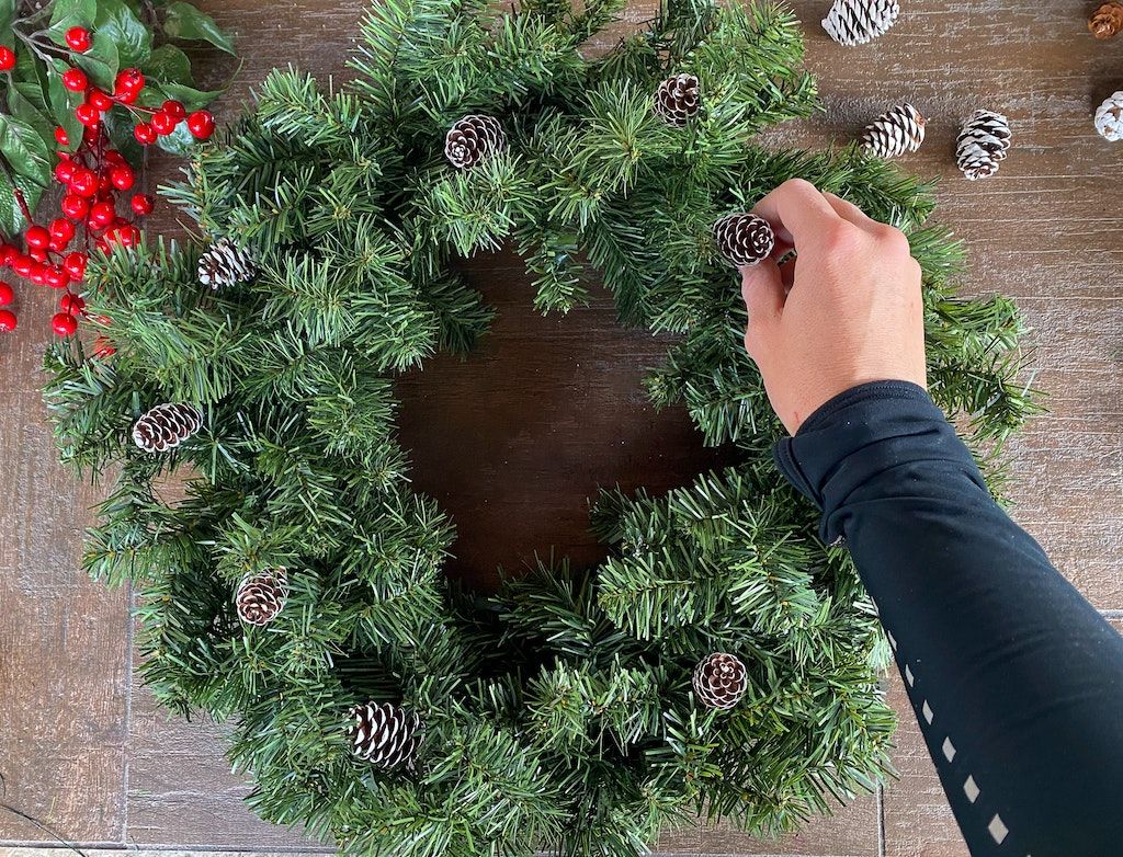 Potom doplňte menšie dekorácie, šišky, bobuľky, guľôčky a rozložte ich rovnomerne. Ozdoby upevnite tavnou pištoľou, floristickým drôtom alebo stužkami, podľa toho, čo vám vyhovuje.