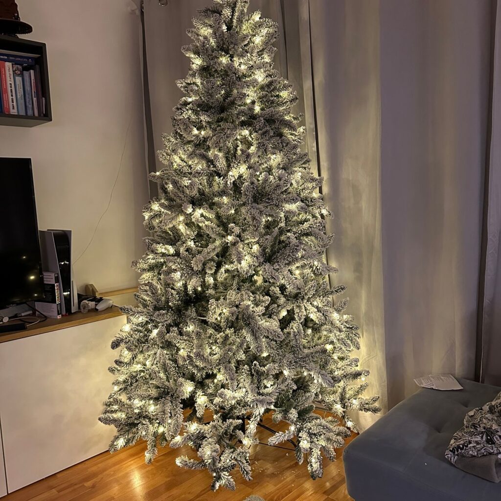 - prirodzene zelený smrek s husto zasneženými koncami vetvičiek