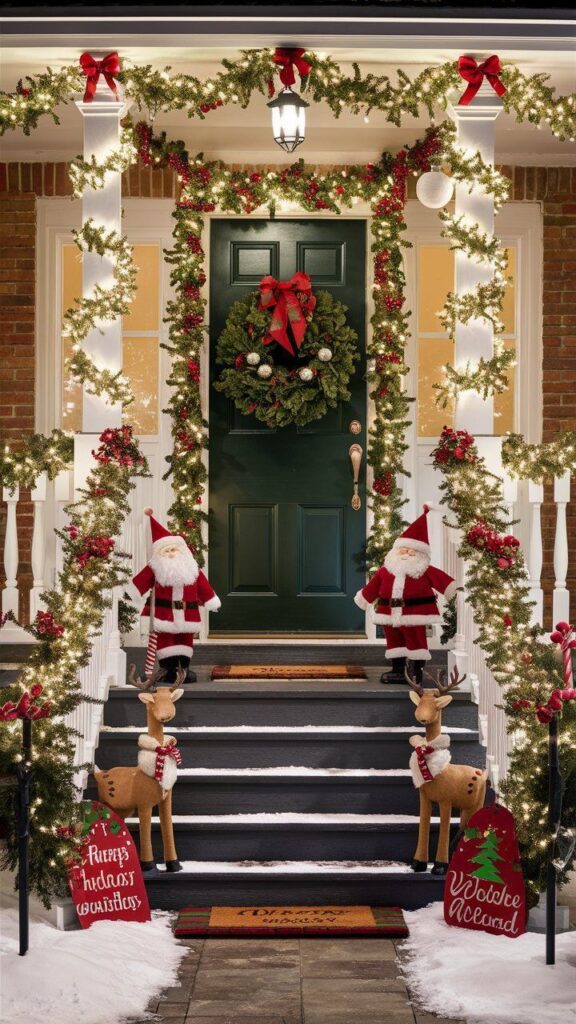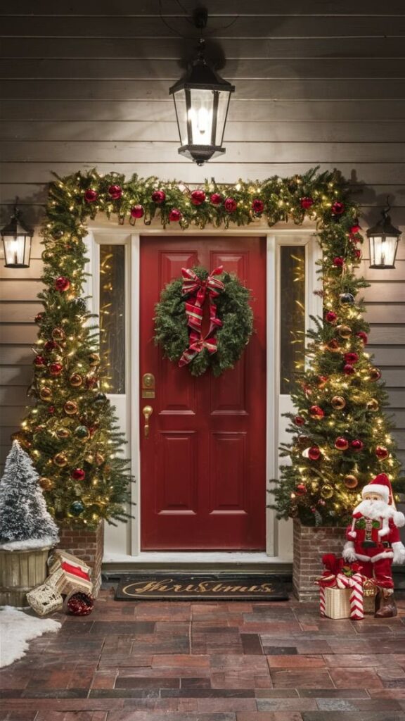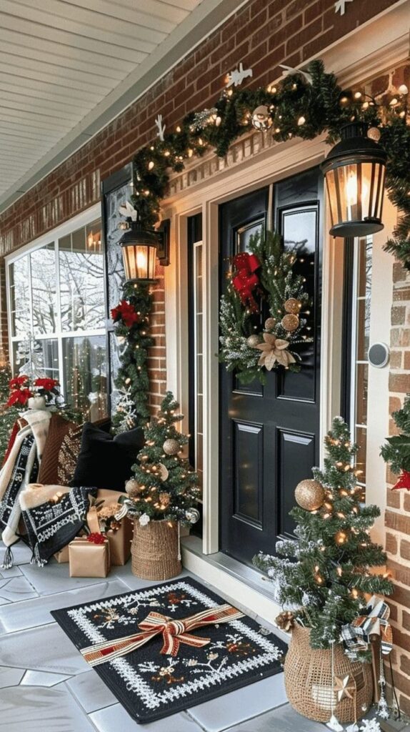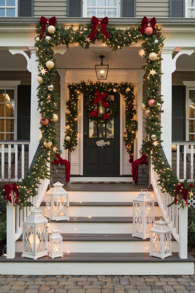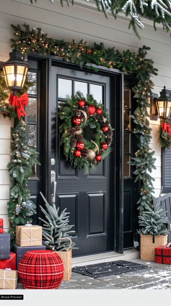 Jednou z najkrajších dekorácií, ktoré môžete využiť vo výzdobe pred vchodovými dverami, je vianočná girlanda. Dá sa použiť na rôzne spôsoby. Skvele vynikne, ak lemuje rám dverí a zvýrazní vstup, alebo ju môžete omotať okolo zábradlia či stĺpov.
